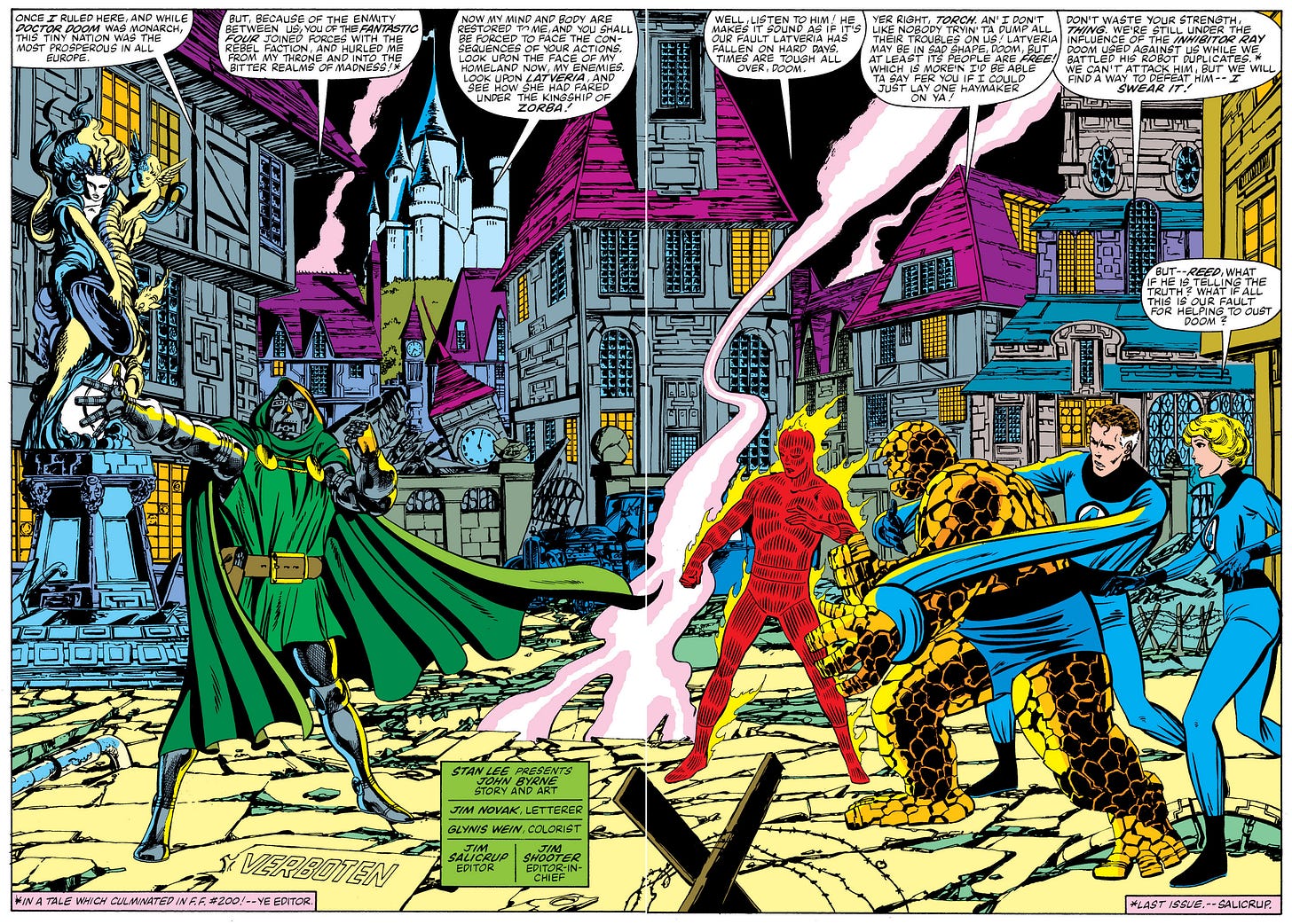 In #236, John Byrne reintroduces Doom in grand fashion after Latveria fell to rebels and Doom himself rendered catatonic in #200. Issue #236 opens with the FF living mundane, alternate lives that have been engineered by Doom himself with the help of the Puppet Master. Together, the two have built this miniature town called Liddleville, populated by minuscule robot people. They capture the FF, transfer their minds into tiny robot versions of themselves, and silently gloat over their powerlessness. Eventually the FF figure out what’s going on and manage to free themselves while the Puppet Master turns on Doom and traps his mind in Liddleville We don’t see Doom again until nearly a year later, when he manages to free himself, abducts the FF once more, and transports them to Latveria so they can help him take his old country back. The guy who overthrew Doom is even more of a cruel dictator than Doom ever was and has run Latveria into the ground. Turns out, the only thing Doom can’t stand more than the Fantastic Four is to see his home country under new management.