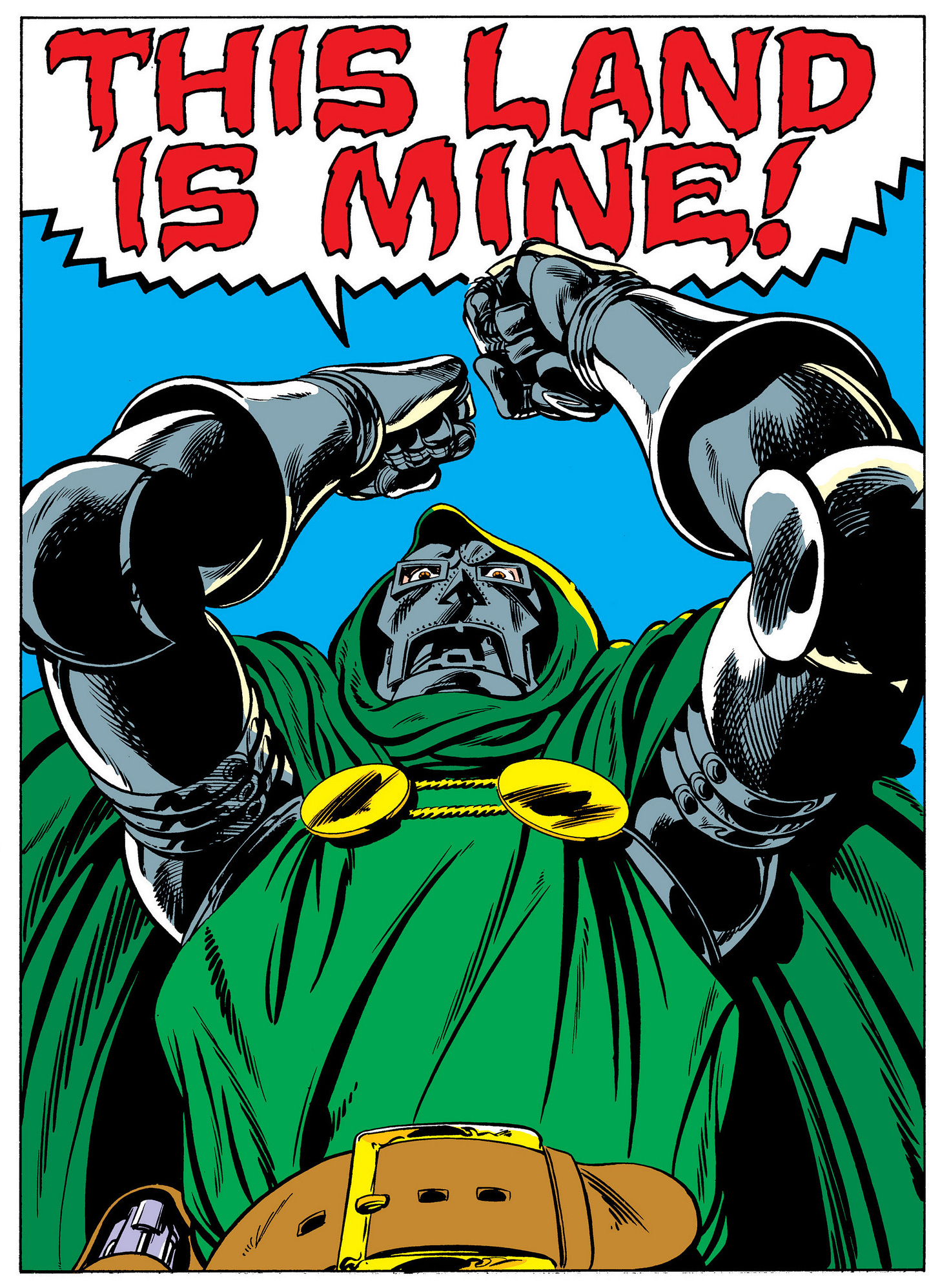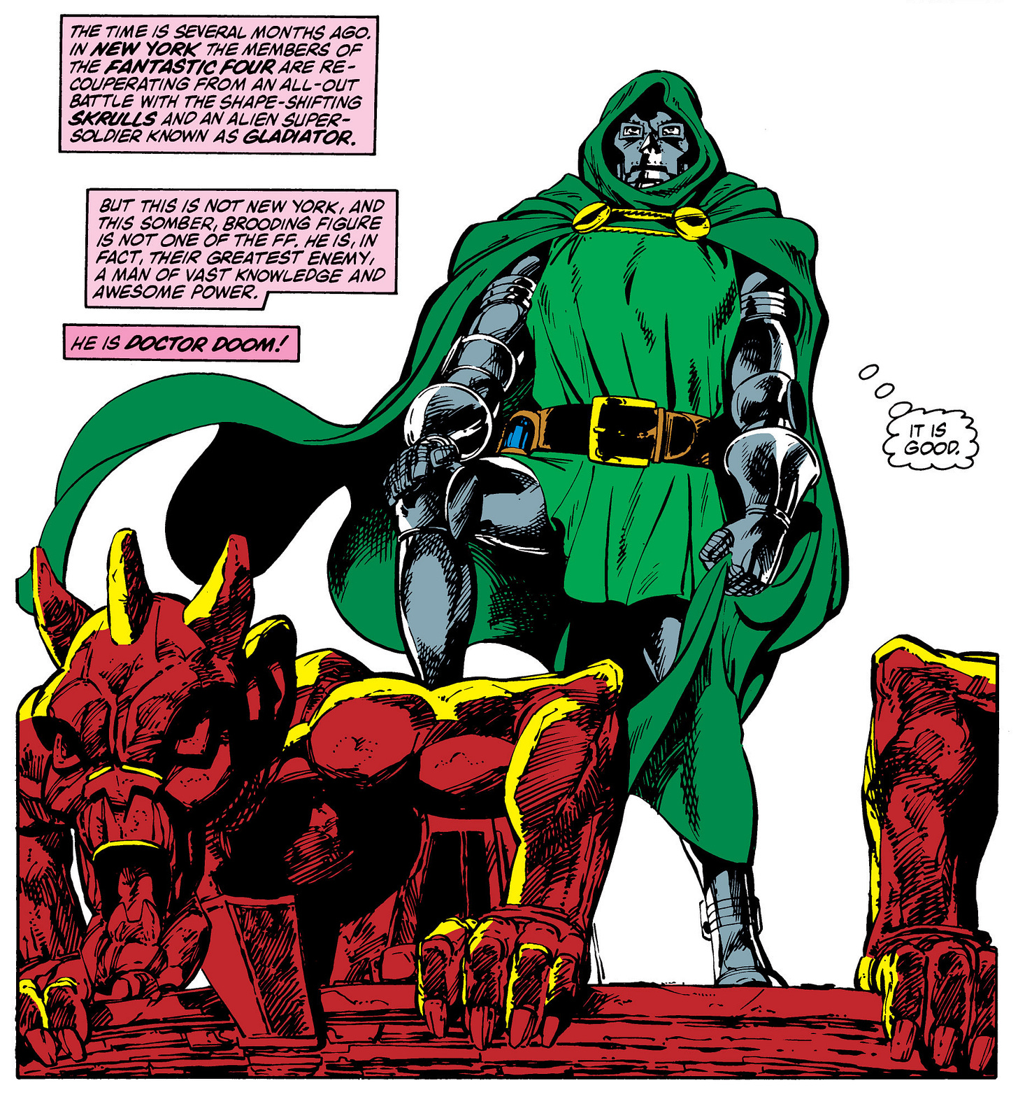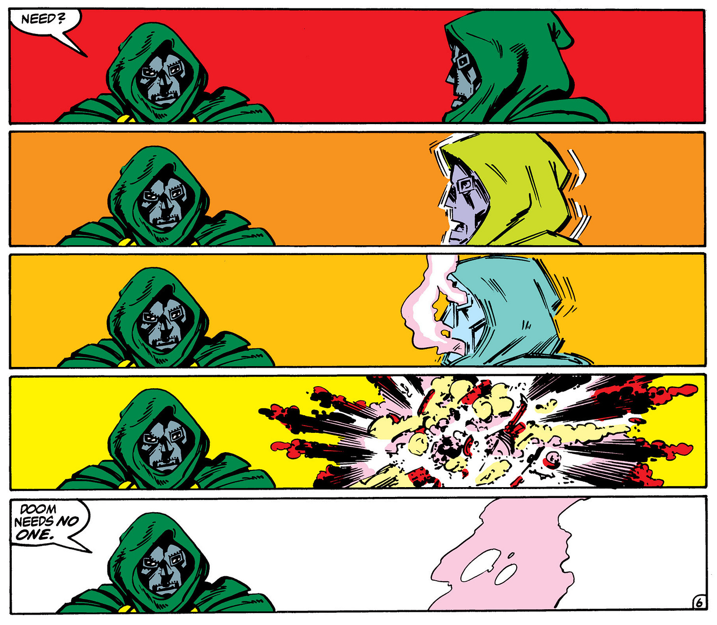 Except that he is not. An egomaniac like Doom never can be. What drives them is a gaping chasm where their heart ought to be and could never be filled if the whole universe was poured into it. He knows that he needed the FF’s help to regain Latveria, and he hates himself for it. Doom pathologically insists he needs no one’s help, even though he knows he couldn’t have regained Latveria without the FF’s help. He knows that no tyrant dies of old age, so he projects his power for the dumbest reasons. When a Doombot reveals that it decided against killing the villain Arcade because Doom might need Arcade as a useful pawn one day, Doom glares at the robot so hard it self-destructs. His resentment and self-loathing is nearly a superpower itself.