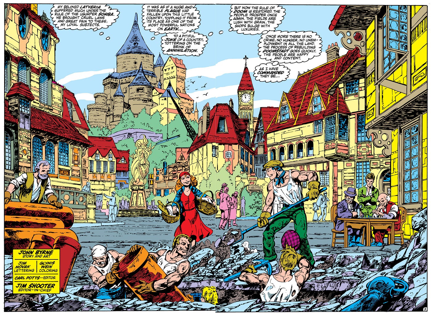 Where this comes to fruition is in #258, when we get a really fun interlude that follows Doom for a day while he tends to his business of running Latveria. The people are glad he is back. Life has returned to what passes for normal when your leader is an armor-clad despot. Things are actually prospering. And for at least one glorious splash page, is almost seems like Doom is content.