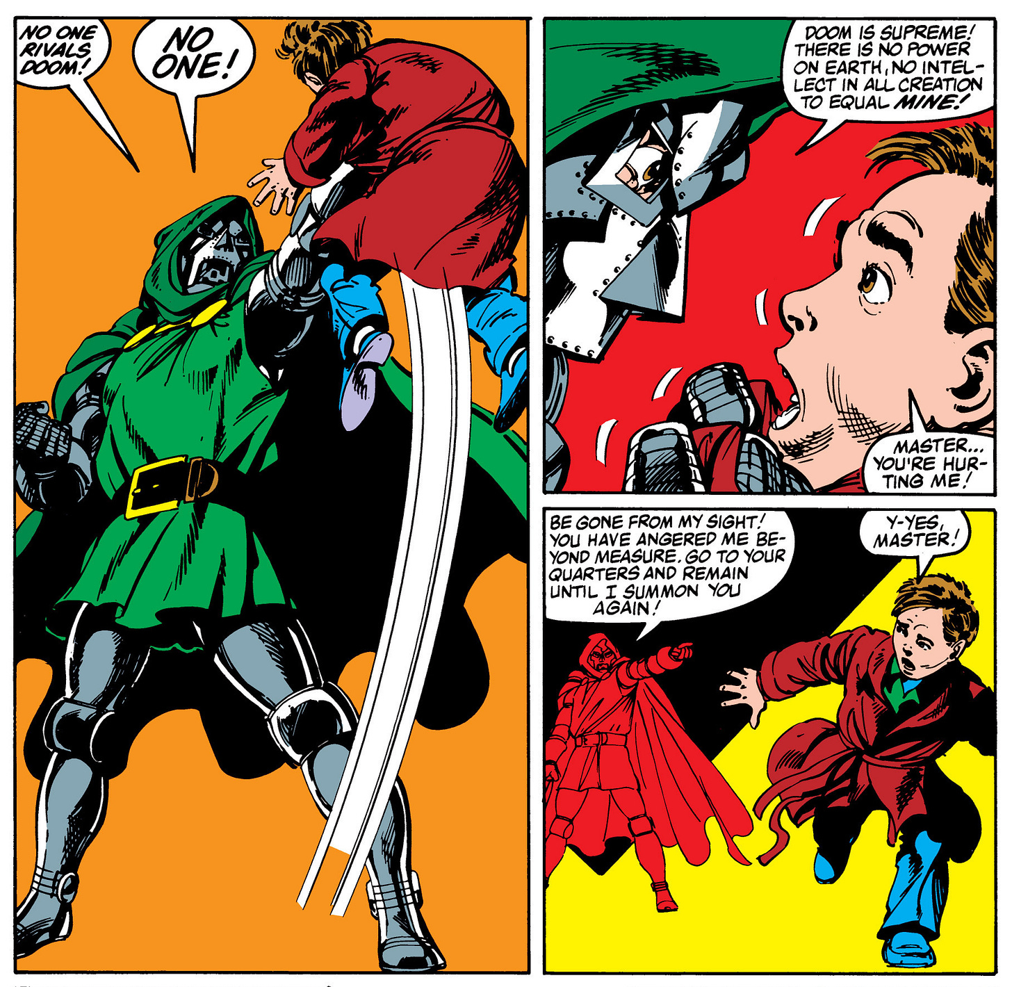 Without hesitation, Doom lifts Kristoff overhead, ranting about his inherent supremacy. He sends the terrified boy away, and we never see him again. Doom probably had him killed to take his mind off the uncomfortable truth that if you’re really as powerful as you think, then an innocent child shouldn’t be what prompts you to prove it.