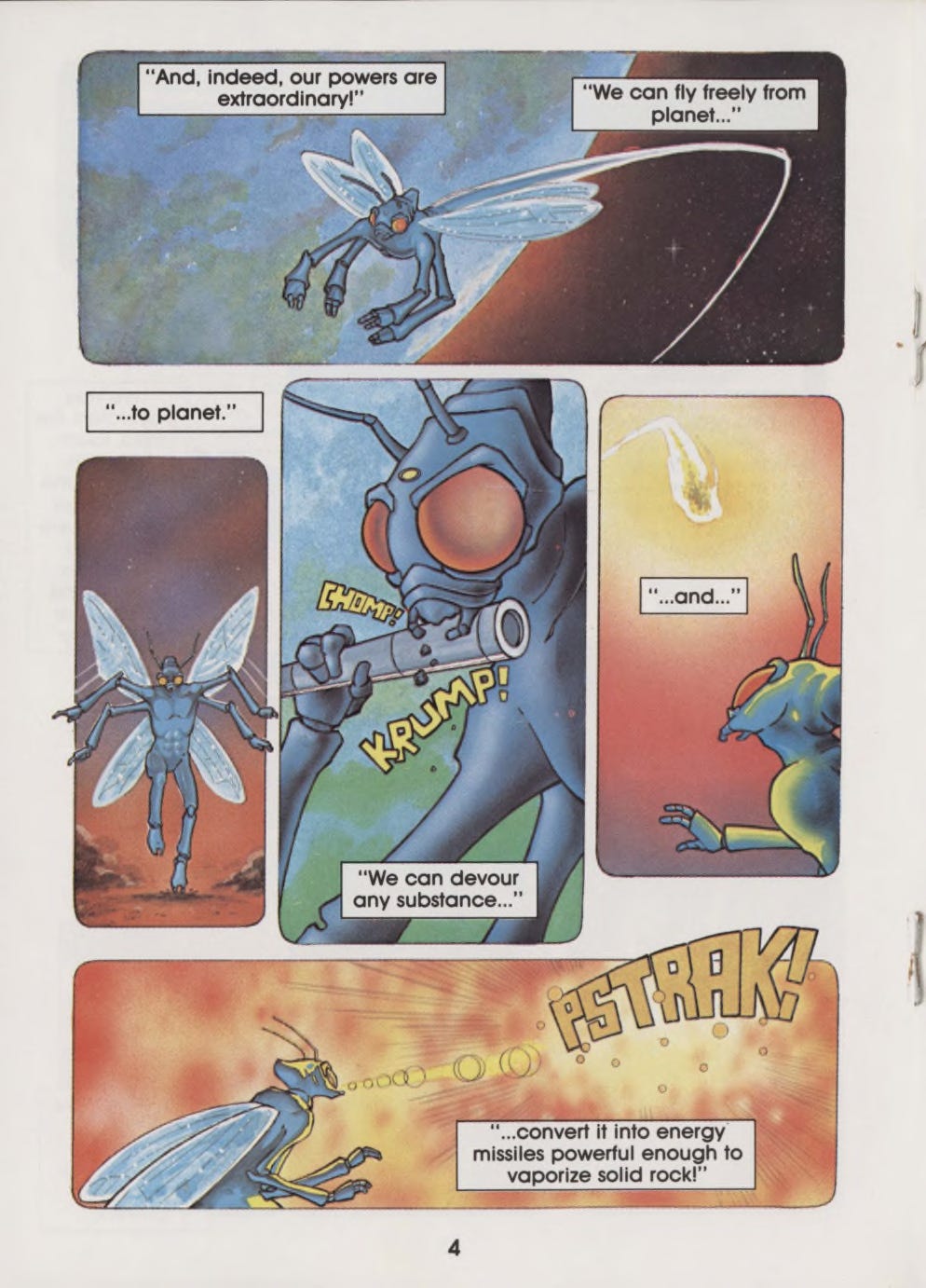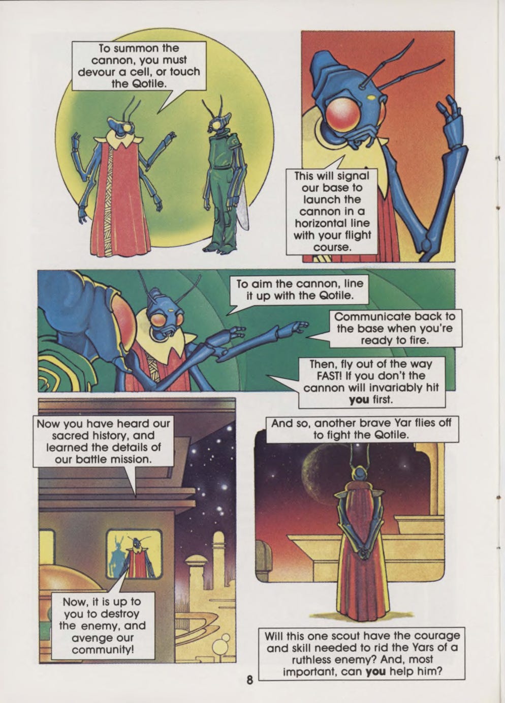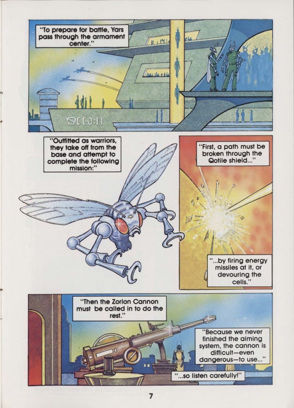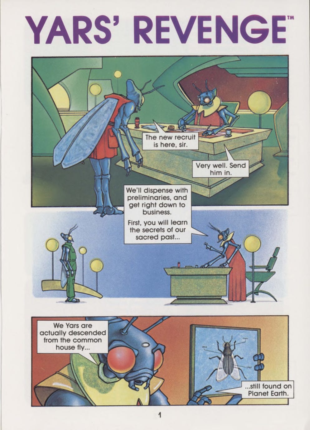 As a writer, every time I designed an alien for something and started running through options in my head, I invariably imagined the gleaming Yar in space—or more often, its fellow, utility-suited recruits training for their big day. And believe it or not, this crazy little book made me look at comics themselves differently, too. I had read all kinds of non-superhero comics before…humor, war, police, horror, even the occasional Classics Illustrated left out for patrons by some wildly naïve barber. But I had never read a comic that wasn’t the star of its own show. It made me wonder why there weren’t more Yars’ Revenge comics. It made me ask why there weren’t more video games with comics in them. And it made me realize that if you could make a comic about a housefly that somehow becomes an interstellar superhero, then you can probably make a comic about anything.