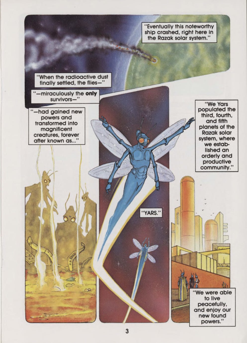 While not about superheroes per se, the Yars had an awfully superheroic origin story, beginning as humble houseflies that hitchhiked on the food supply of an interstellar spaceship. When that ship crashed on an alien planet, the flies survived and mutated into graceful humanoids who could fly between the stars, eat any matter, and convert it into powerful energy blasts they fired from their mouths.